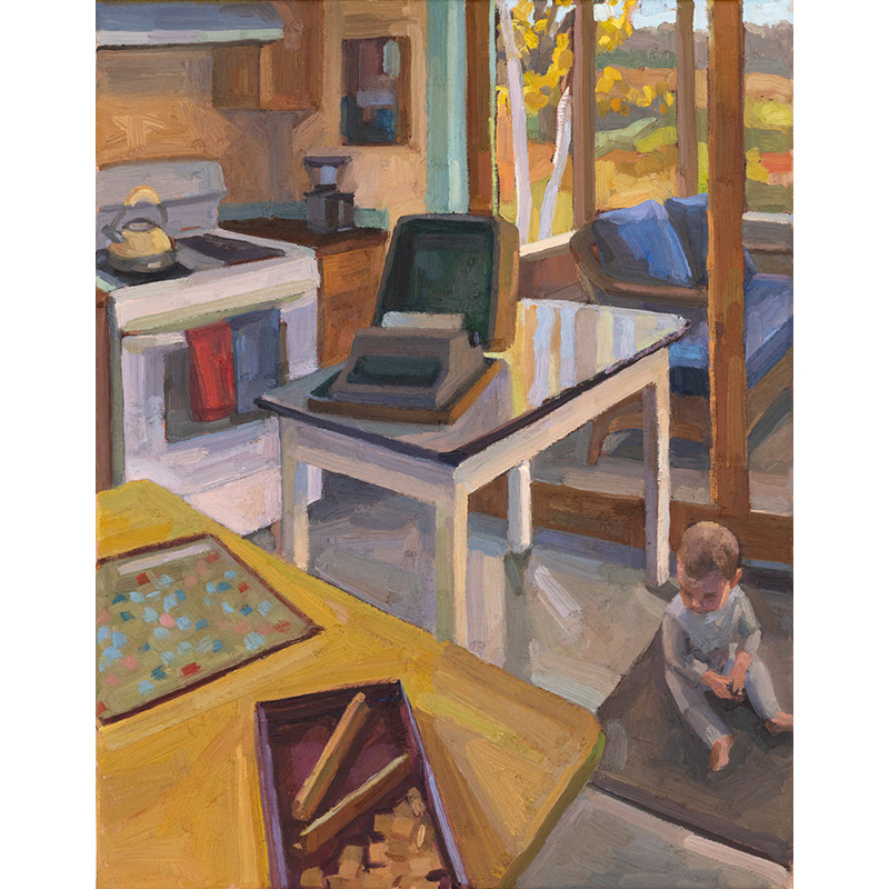 Scrabble Board, Typewriter, and Baby Varian, oil on linen, 19 x 15 inches, 2024