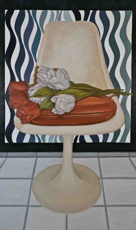Portrait of Chair with Tulips and Bridget Riley's Arrest 2 (1965), oil on canvas, 60 x 36 inches, 2011