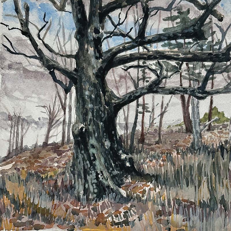 Old Road Oak, 8x8 inches, watercolor, 2023
