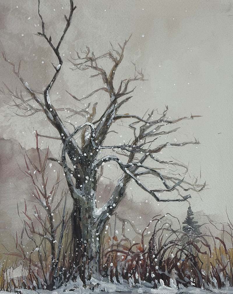 Dead Wood in the Snow, 10x8 inches, watercolor, 2023
