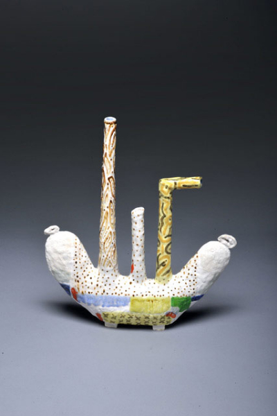 Three Spouted Vessel, Earthenware clay and glaze, 22 x 23 x 6 inches, 2020
