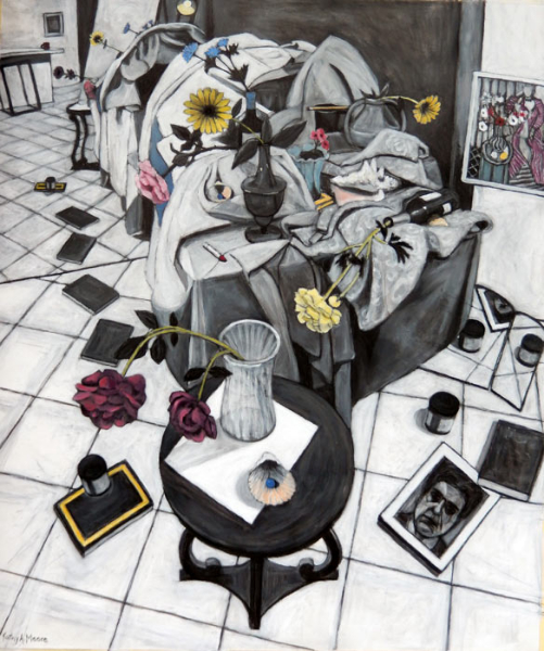 Matisse, Bell, and Mirrored Still Life, black Conte crayon, gesso, gouache, acrylic paint on Rives printmaking paper, 42 x 36 inches
