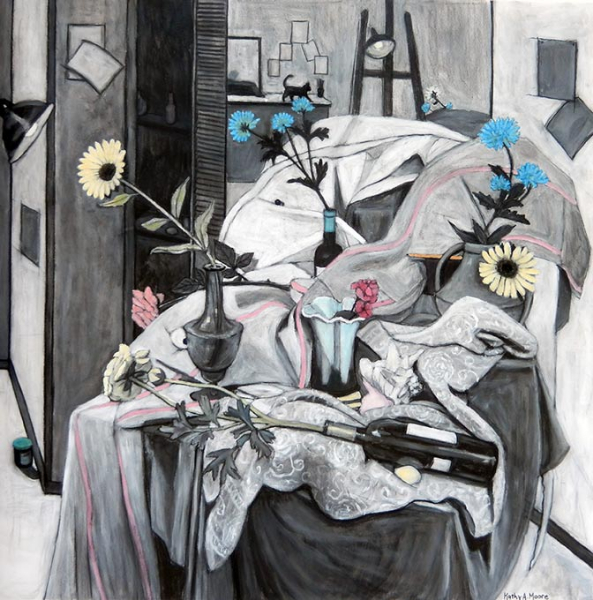 Pink Strip Still Life with Mirrored Image, black Conte crayon with gesso and gouache on Rives printmaking paper, 36 x 36 inches