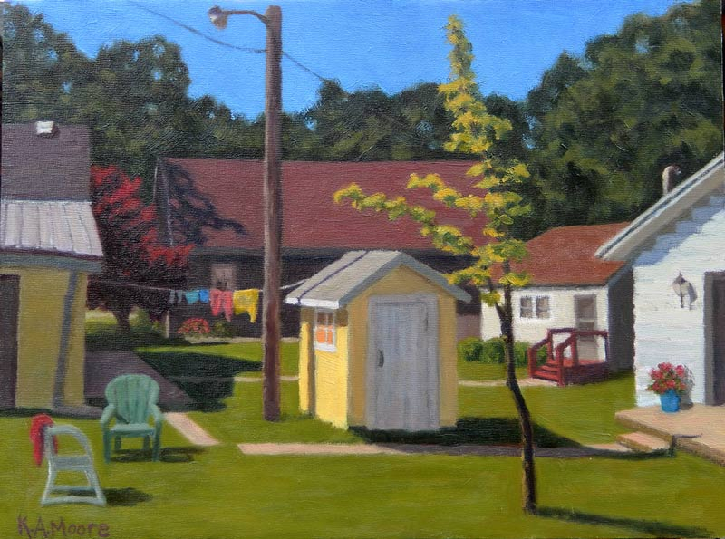 Yellow Shed in Shared Backyards, oil on hardboard, 12 x 16 inches