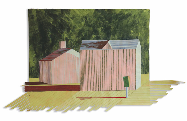 Little pink houses, acrylic painted, cut paper, 26 x 46 inches, 2020