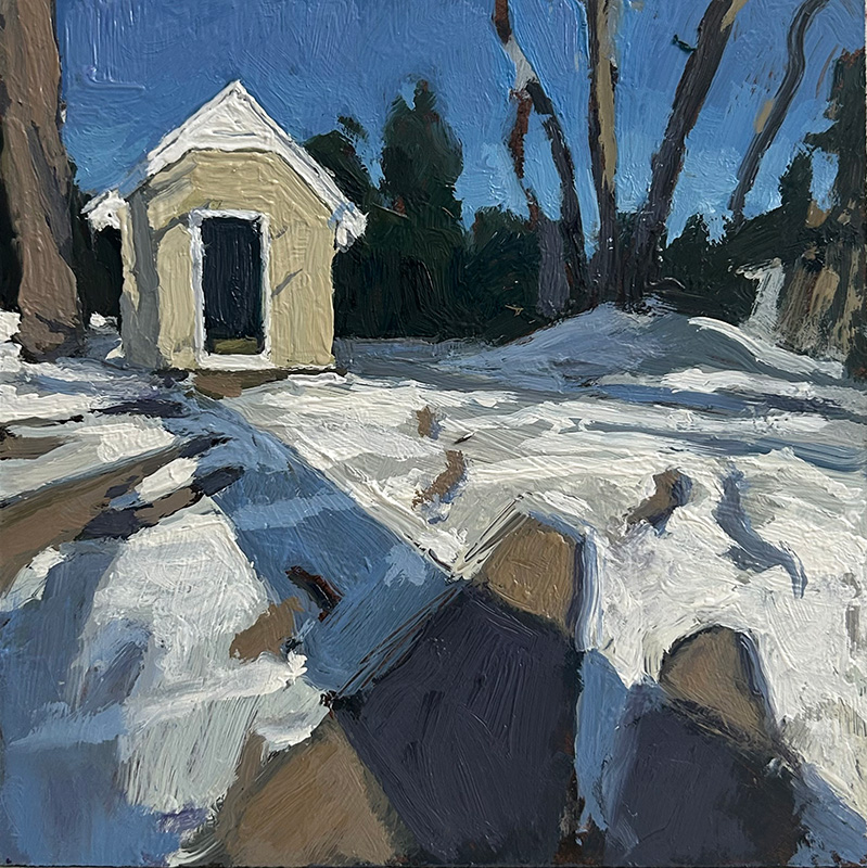 Winter Landscape with Shed, oil on panel, 5.5 x 5.5 inches, 2025