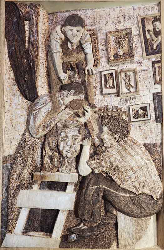 Chaim Gross Makes a Movie, mahogany, burned and painted, 26 x 16 x 12 inches, 2020