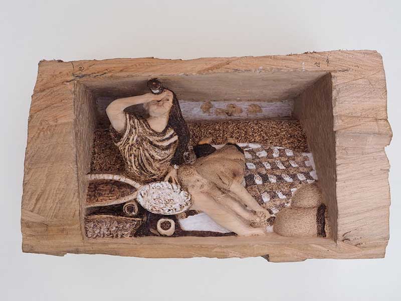 Last Beach Day, maple, burned and painted, 9 x 16 x 6 inches, 2021